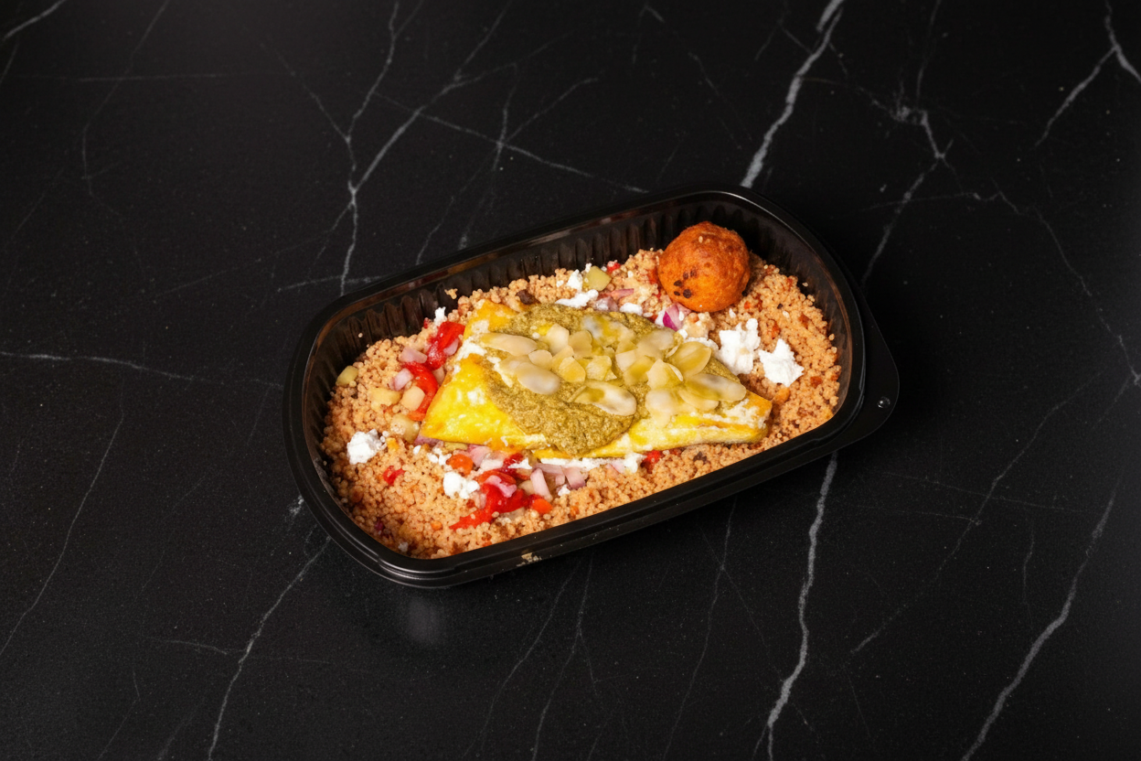 Served with roasted red pepper and feta cheese couscous.