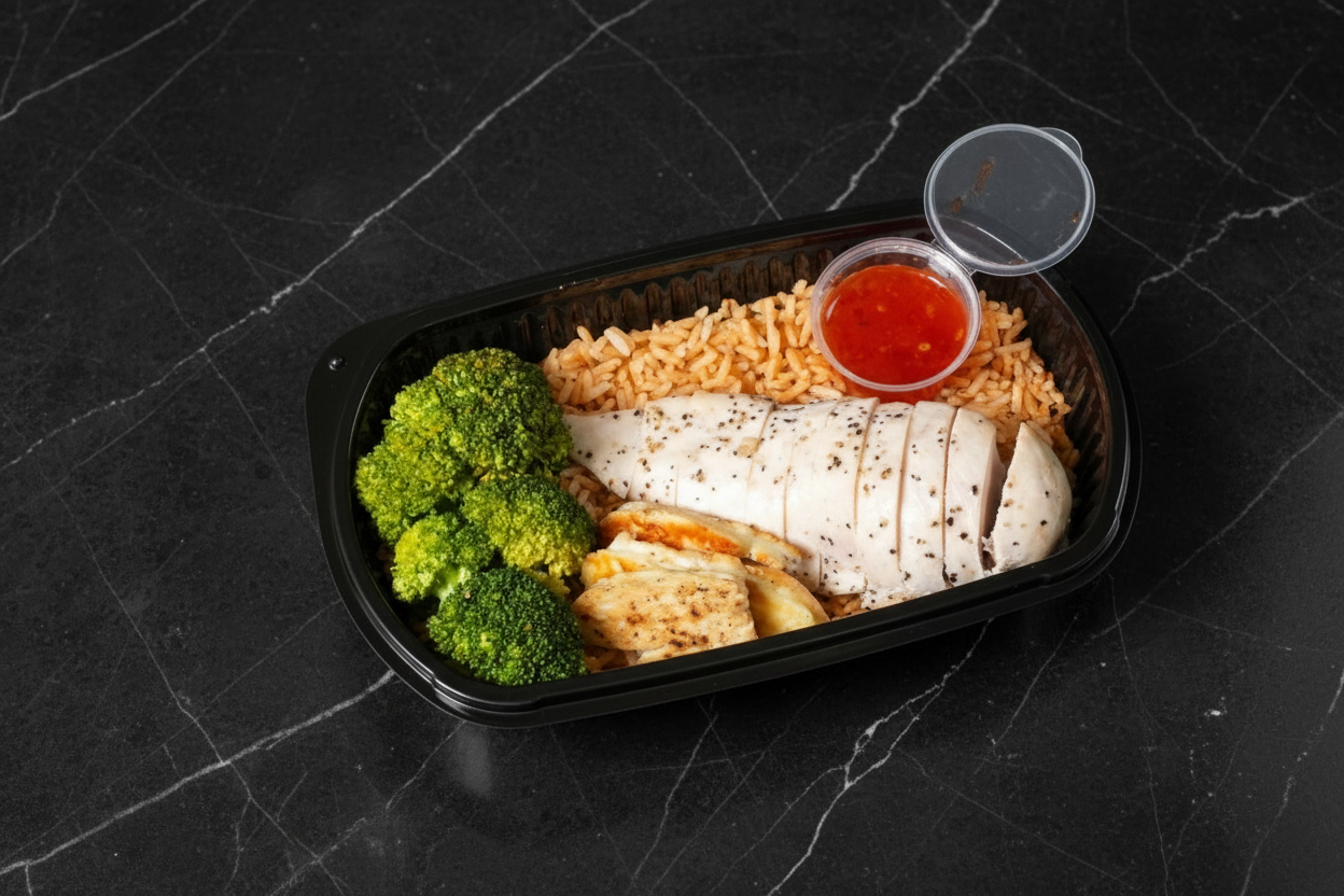 Served with mediterranean rice and a serving of seasoned broccoli.