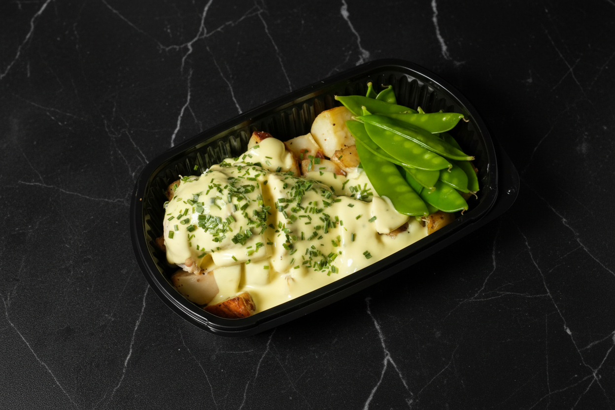 Chicken breast served with sauteed potatoes, honey mustard sauce & mangetout.