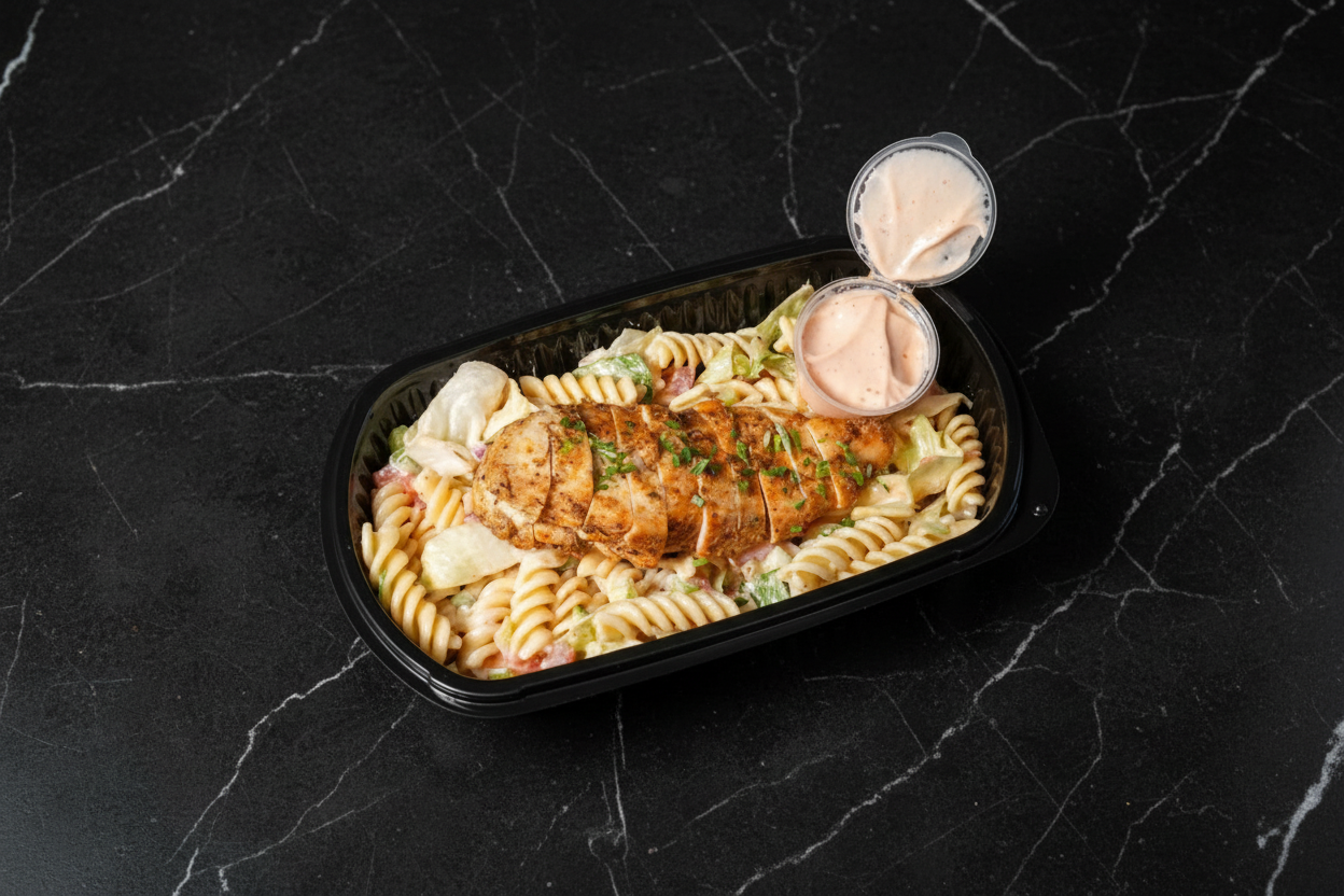 Cajun-spiced chicken with pasta, chopped lettuce, tomato, cucumber and red onion — all tossed in our spicy mayo.