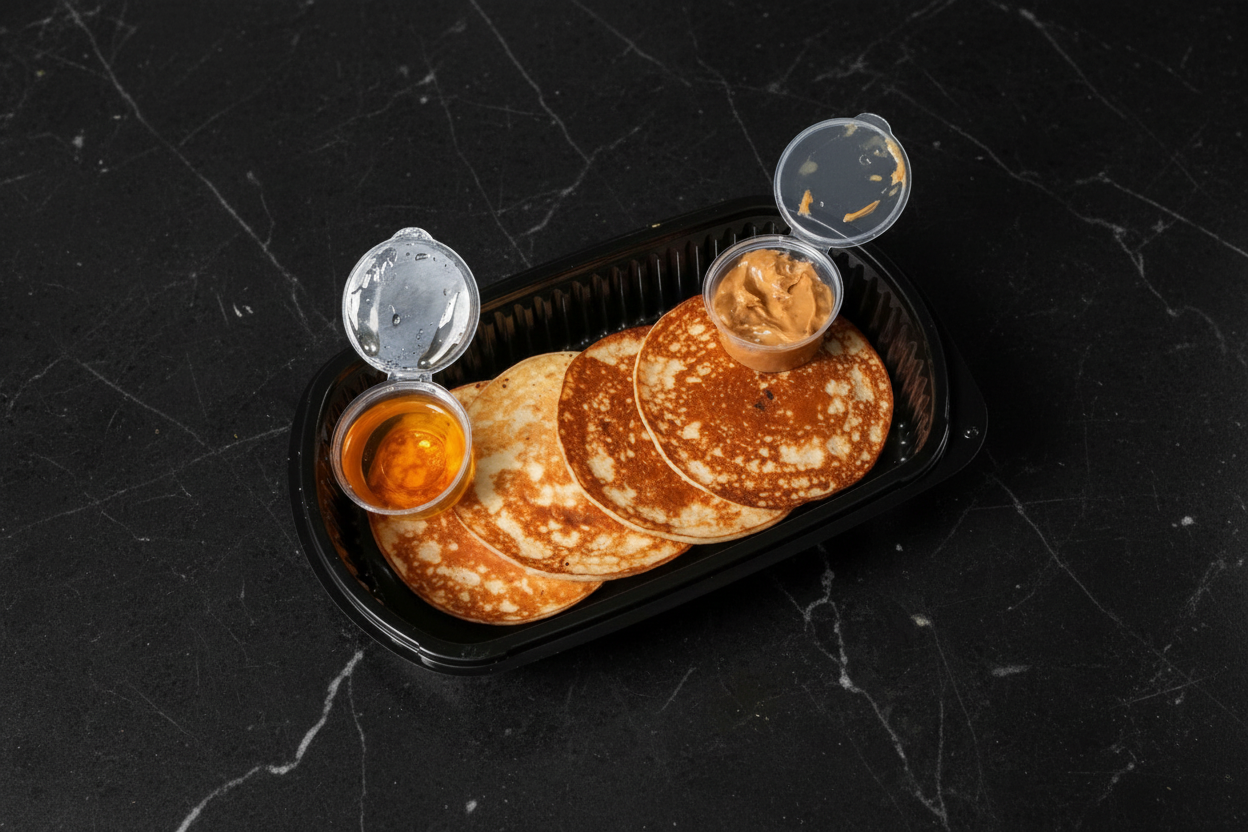 Protein pancakes Served with crunchy peanut butter & organic agave syrup.