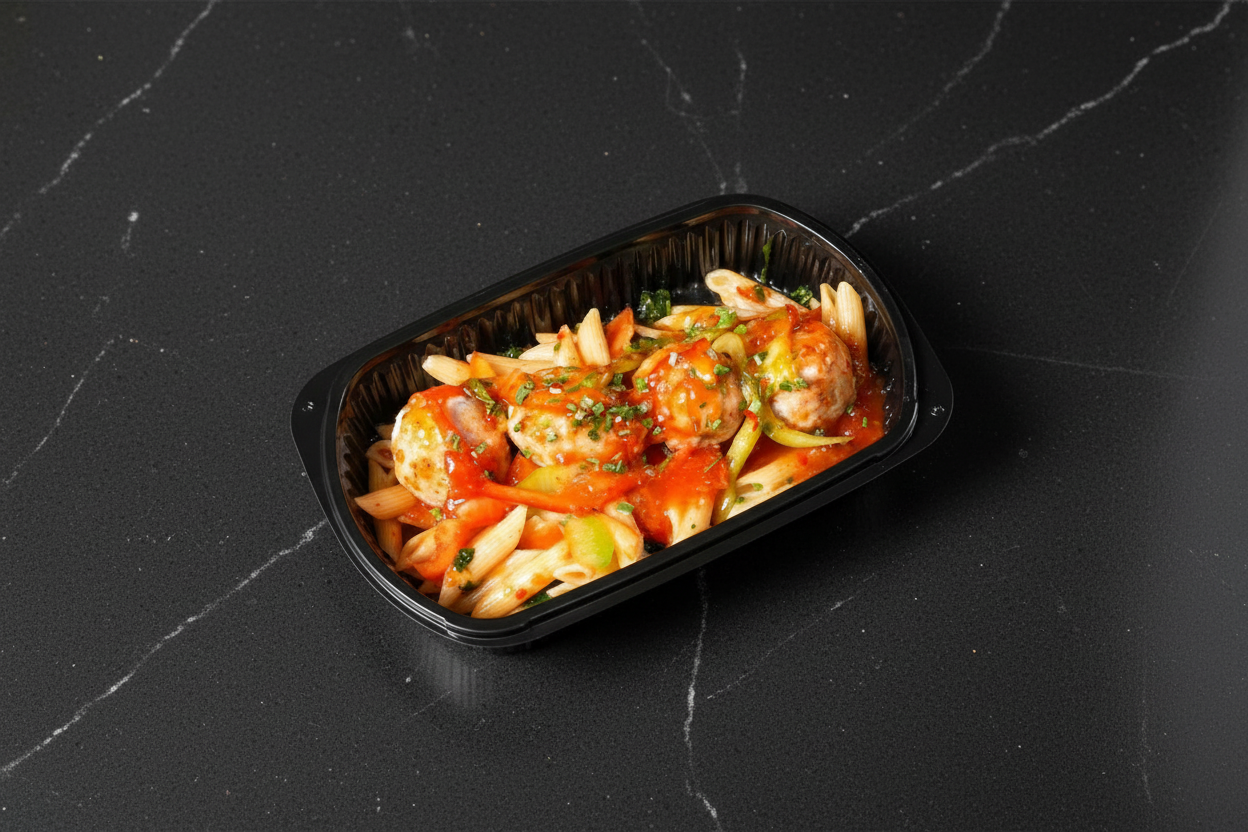 Served with penne pasta, sautéed spinach & mixed peppers in a sticky tomato-honey glaze.