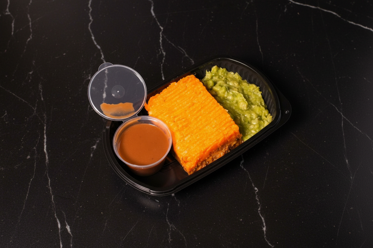 Our take on a traditional cottage pie, topped with a smooth sweet potato mash served with mushy peas and gravy.