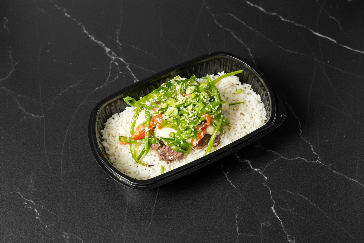 Fragrant Thai green Curry – Sliced Mangetout, Peppers. Spring Onion – Sesame Seed Garnish.