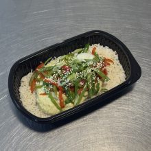 Fragrant Thai Green Curry – Sliced Mangetout, Peppers. Spring Onion – Sesame Seed Garnish.